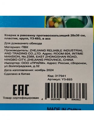 Коврик в раковину противоскользящий круглый, пластик, 28х30 см, в ассортименте, Y3-693