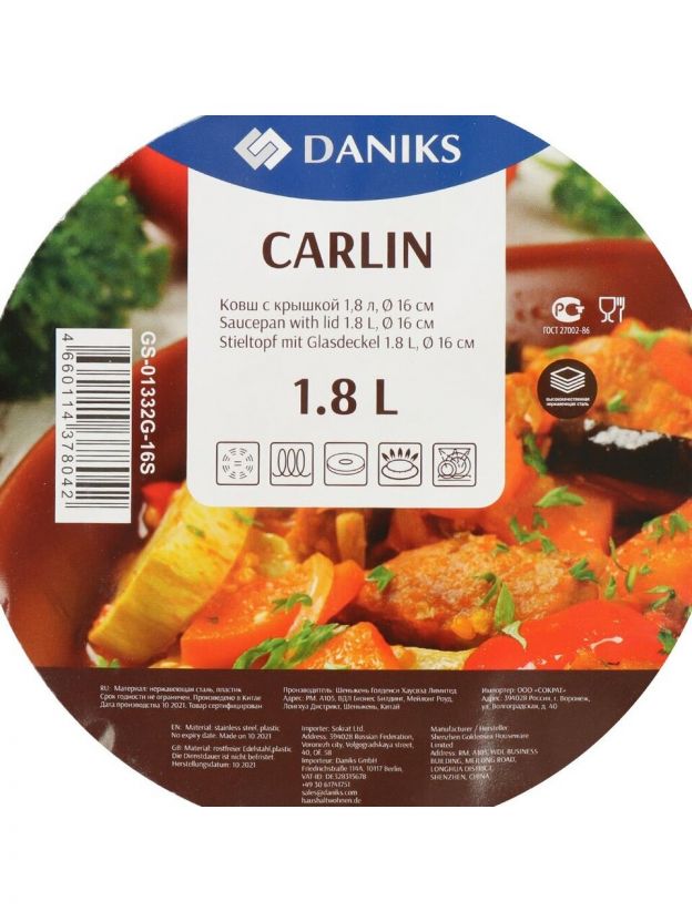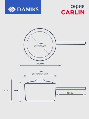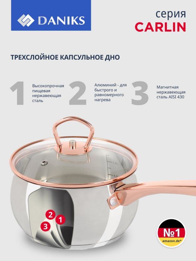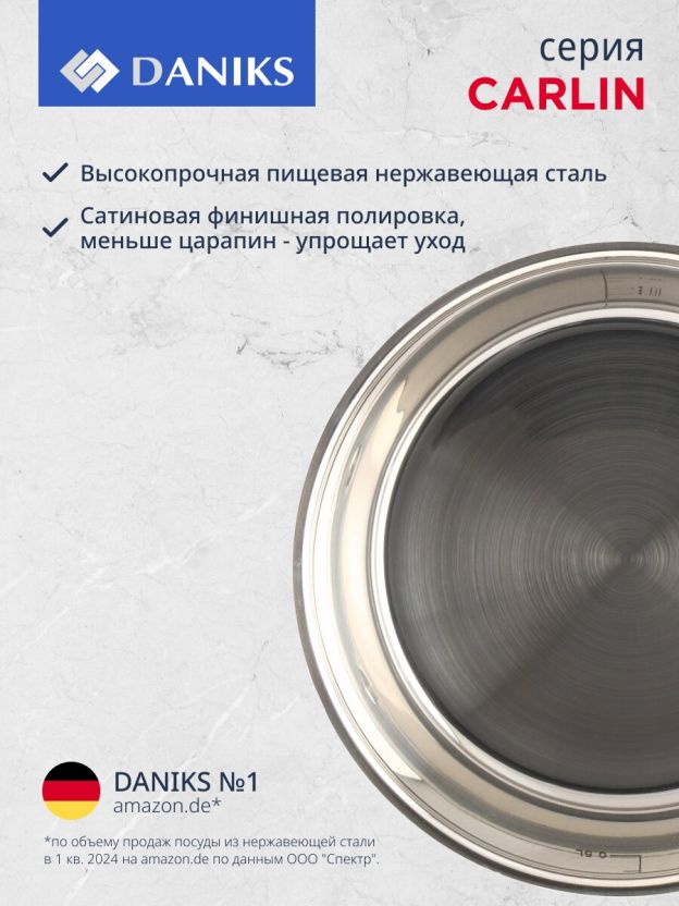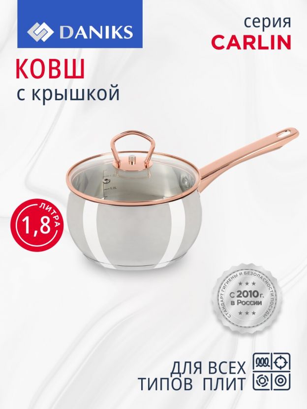 «Daniks» – отечественный бренд, который уже 10 лет радует покупателей функциональной и современной посудой. Качественные материалы и современные технологии способствуют долгому сроку службы изделий. А соответствие всем экологическим нормам характеризует изделия торговой марки «Daniks» безопасными для потребителя. На внешней боковой стороне и на дне ковша указано название бренда.
