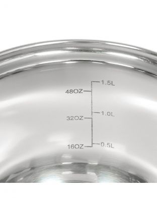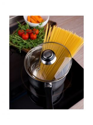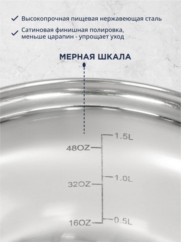 Объём — 1.9 л, диаметр — 17.5 см, толщина дна — 0.5 мм, толщина стенок — 0.3 мм, мерная шкала внутри, подходит для газовых, электрических и стеклокерамических плит.