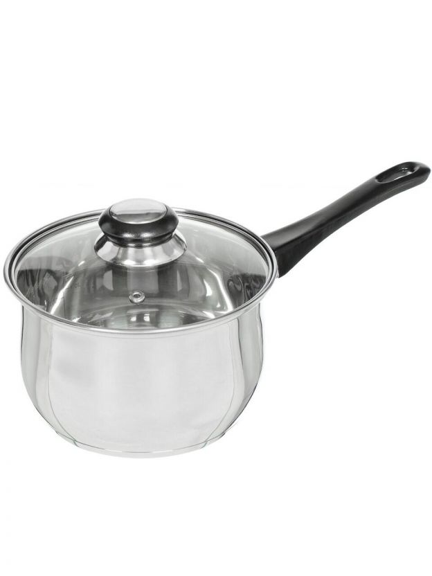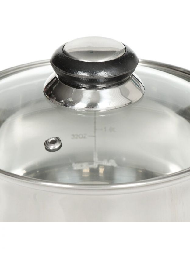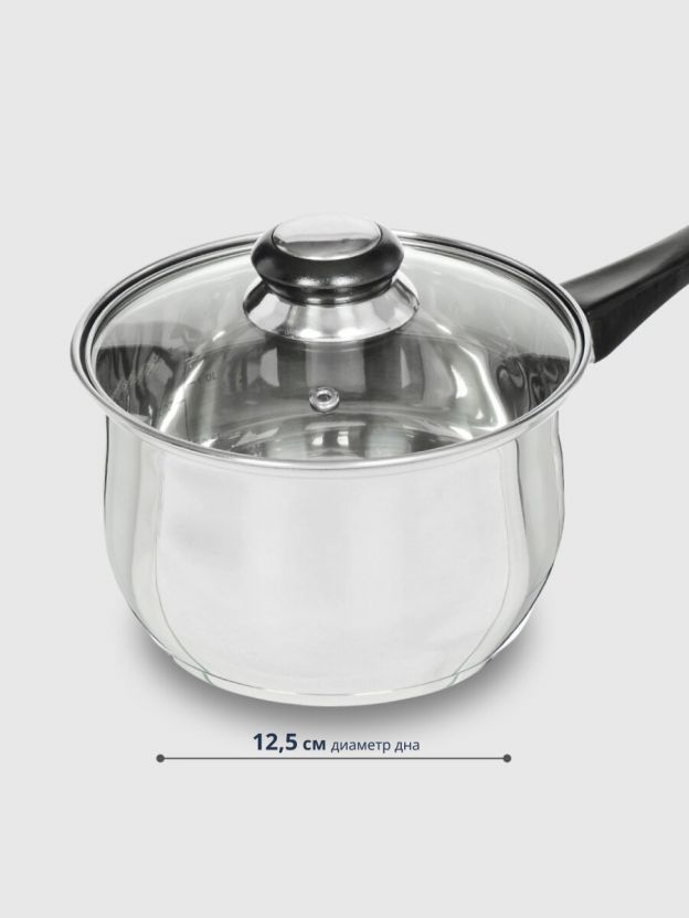 Ковш из нержавеющей стали 1.9 л с бакелитовой ручкой и стеклянной крышкой — идеальное решение для дома и дачи: долговечность, безопасность, удобство.