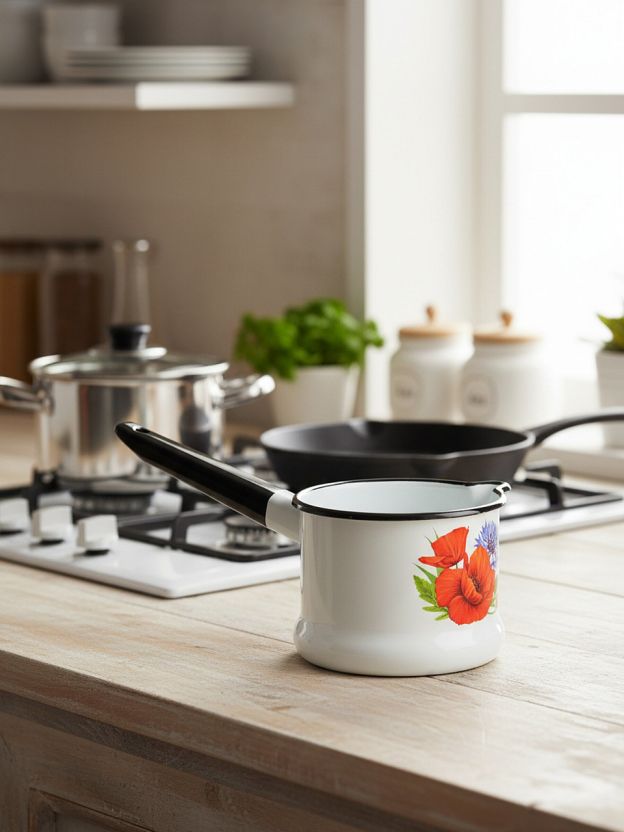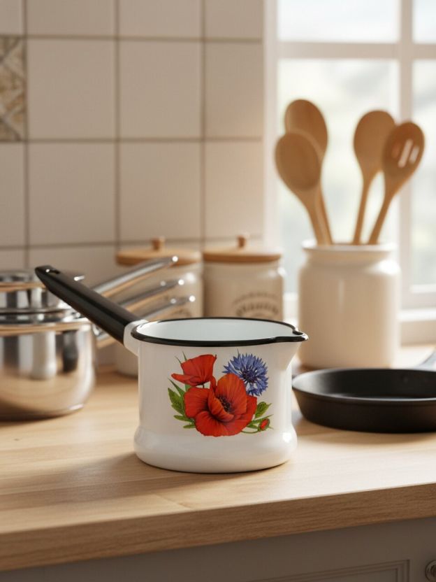 Стальная эмалированная посуда производится из высококачественного металла, покрытого двумя слоями жаропрочной эмали. Для производства посуды используются экологически чистые цветные эмали, обеспечивающие высокую коррозийную стойкость.