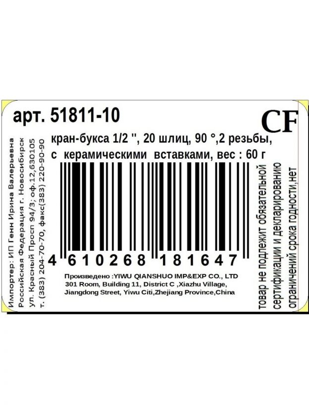 Кран-букса 1/2'', 20 шлиц, 90°, 2 резьбы, с керам вст, 60 г, инд.уп., ComfortFactor, 51811-10 — надежное решение для сантехнических работ и ремонта смесителей. Современная керамическая вставка обеспечивает плавное и долговечное функционирование. Прочный корпус и удобная конструкция гарантируют легкую установку и совместимость с множеством моделей. Выгода: быстрая замена и долгий срок службы без лишних затрат.