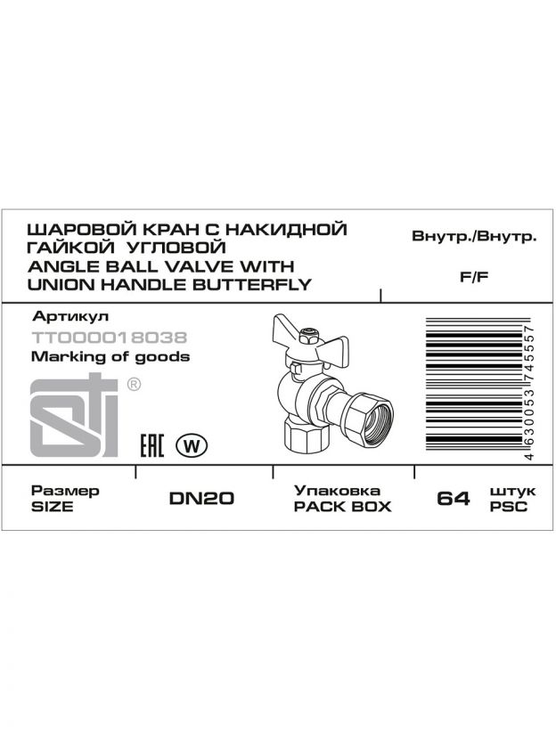 Кран для бытовых приборов, 3/4", г-г, латунь, с накидной гайкой, угловой, STI