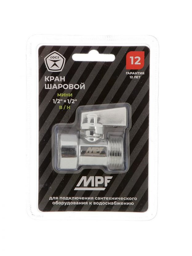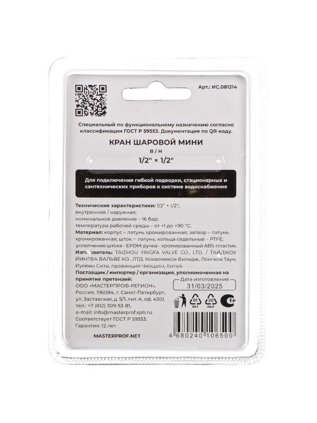 Кран для воды (мини), 1/2", г-ш, латунь, ручка-флажок, ИС.081214, MasterProf