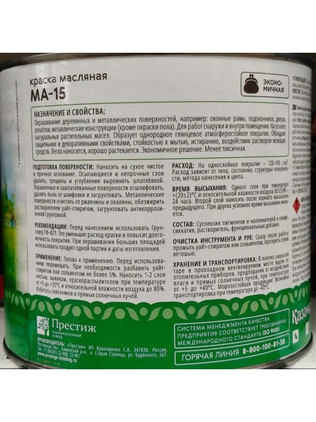 - Состав: Олифа на основе растительных масел высшего сорта, органические и неорганические пигменты, добавки, наполнители.