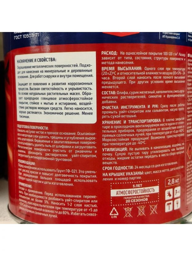 Состав: Олифа, сурик железный, наполнители, смесь органических растворителей, сиккатив и функциональные добавки.