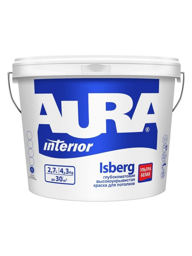 Краска водно-дисперсионная, Aura, Isberg, акриловая, для потолков, матовая, 2.7 л