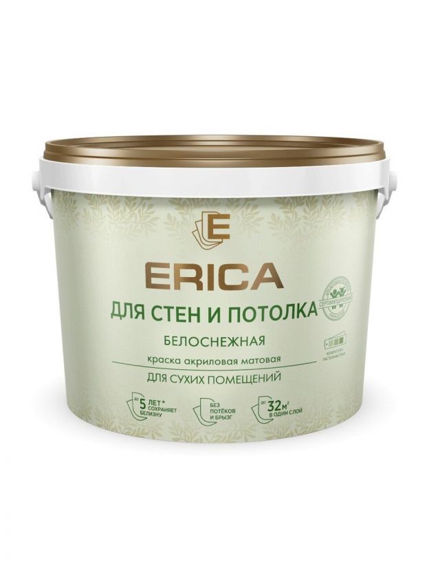 Краска водно-дисперсионная, Erica, акриловая, для стен и потолков, матовая, белая, 4.5 кг