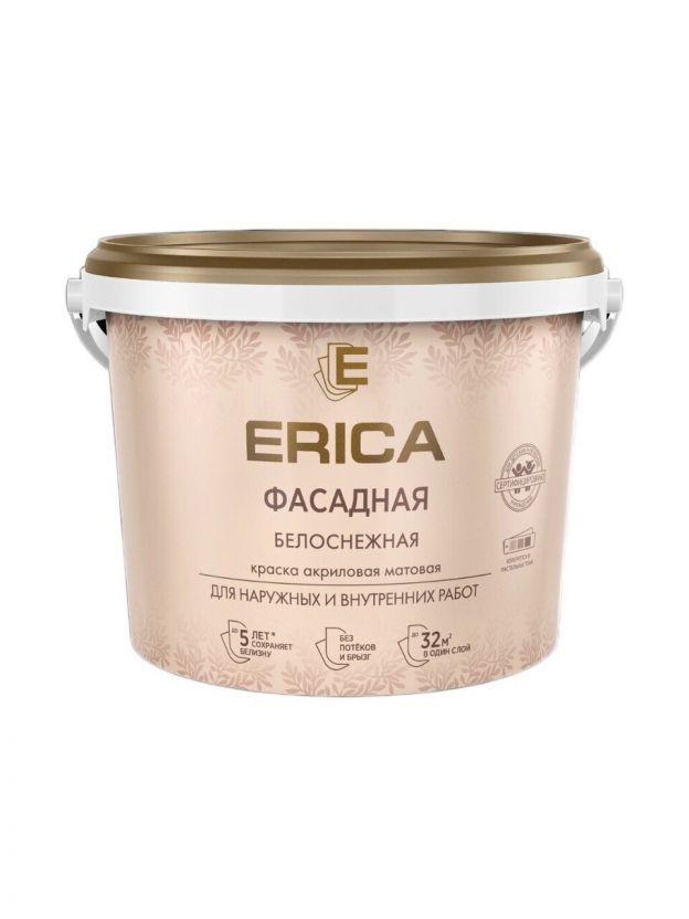 Краска водно-дисперсионная, Erica, акриловая, фасадная, моющаяся, влагостойкая, матовая, белая, 4.5 кг