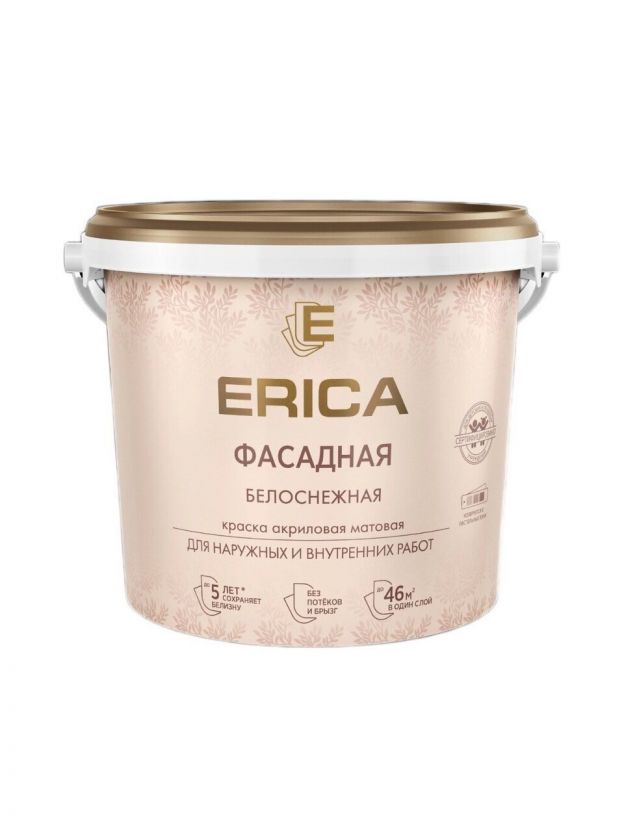 Краска водно-дисперсионная, Erica, акриловая, фасадная, моющаяся, влагостойкая, матовая, белая, 6.5 кг