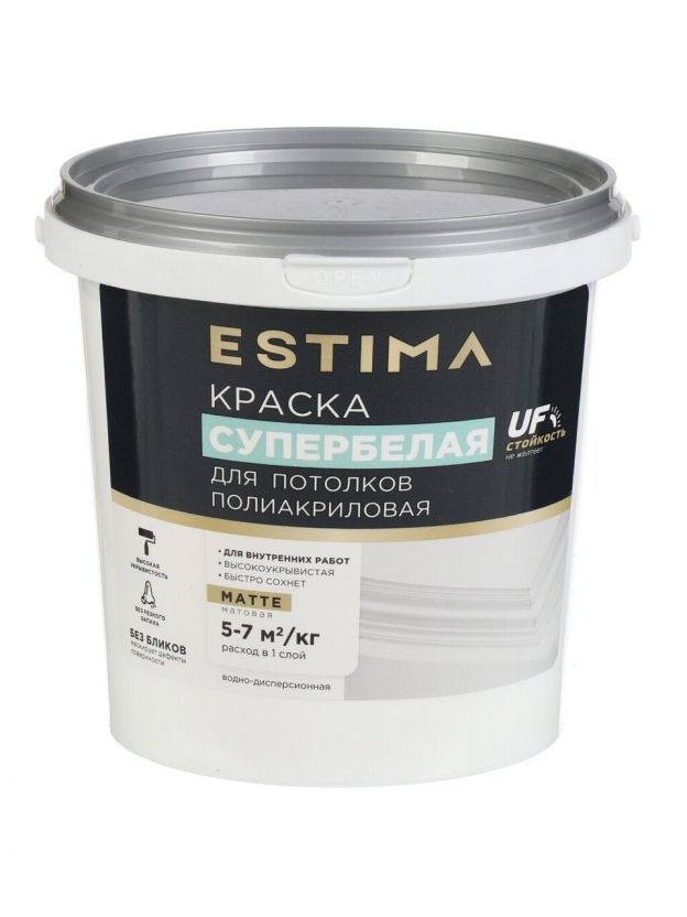 Краска водно-дисперсионная, Estima, полиакриловая, для потолков, матовая, супербелая, 1.5 кг