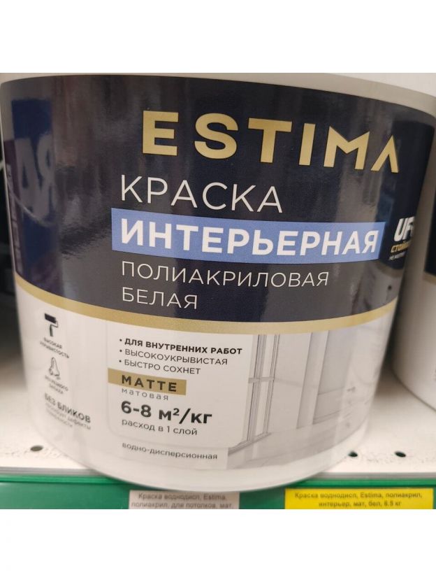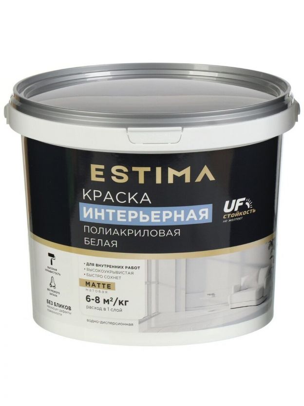 Краска водно-дисперсионная, Estima, полиакриловая, интерьерная, матовая, белая, 6.5 кг