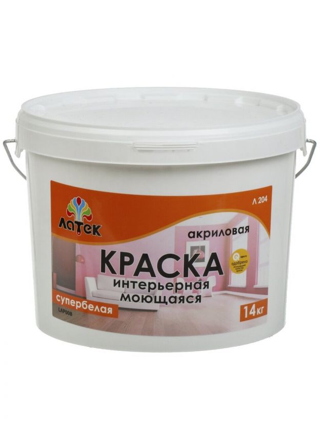 Краска водно-дисперсионная, Оптимист, Латек Л204, акриловая, интерьерная, моющаяся, супербелая, 14 кг
