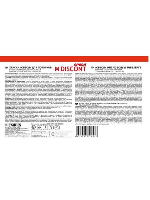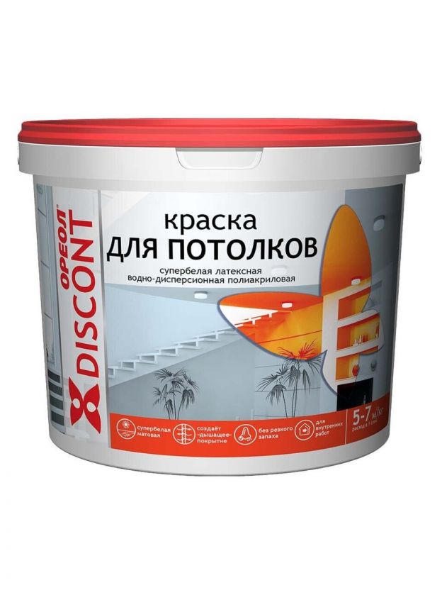 Краска водно-дисперсионная, Ореол, Дисконт, акриловая, для потолков, матовая, белоснежная, 6.5 кг