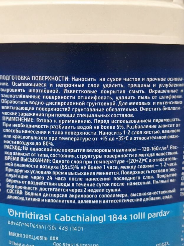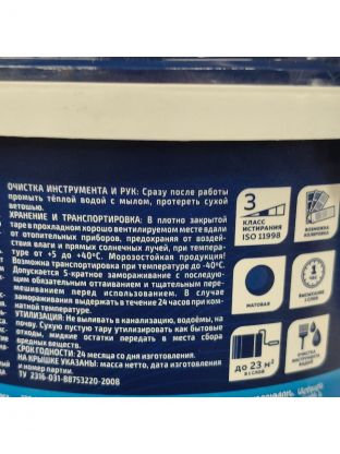 - Состав: Водная дисперсия акрилового сополимера, высококачественные пигменты, наполнитель, целевые и антисептические добавки, вода.