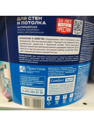 Экологически чистая акриловая краска. Обладает хорошей устойчивостью к истираемости. Данная краска образует ровную матовую поверхность и остается остается белоснежной долгие годы. Является универсальной и обладает хорошими адгезией и укрывистостью. Также краска удобна: в работе не стекает и не разбрызгивается.