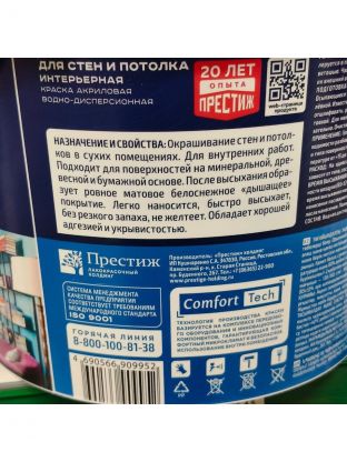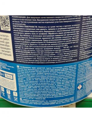 Экологически чистая акриловая краска. Обладает хорошей устойчивостью к истираемости. Данная краска образует ровную матовую поверхность и остается остается белоснежной долгие годы. Является универсальной и обладает хорошими адгезией и укрывистостью. Также краска удобна: в работе не стекает и не разбрызгивается.