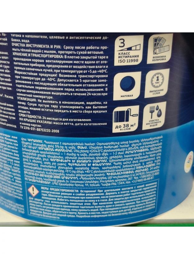 • Состав: Водная дисперсия акрилового сополимера, высококачественные пигменты, наполнитель, целевые и антисептические добавки, вода.