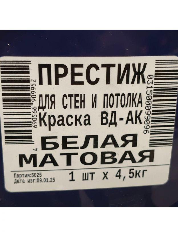 Краска водно-дисперсионная, Престиж, W3 ВД-АК-212, акриловая, интерьерная, матовая, супербелая, 4.5 кг