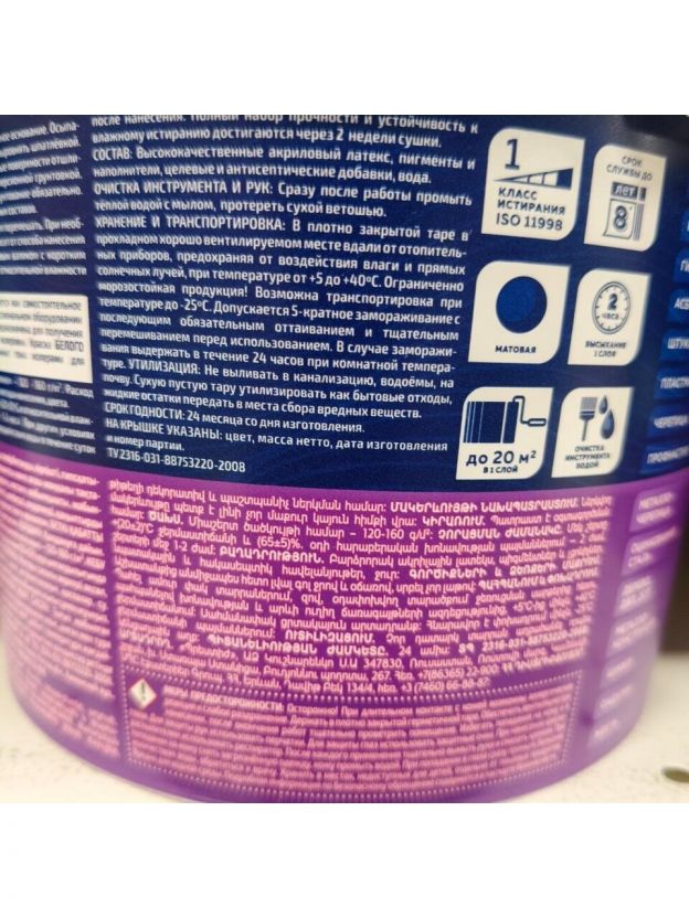 - Состав: Высококачественные акриловый латекс, пигменты и наполнители, целевые и антисептические добавки, вода.