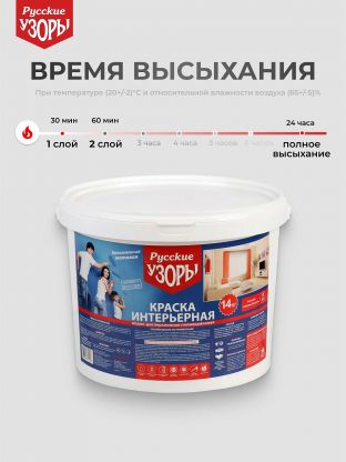 - Время высыхания при температуре (20+/-2)°C и относительной влажности воздуха (65+/-5)%: - одного слоя - 0,5 ч; - между слоями - 1 ч. Поверхность готова к эксплуатации через 24 ч после нанесения последнего слоя краски.