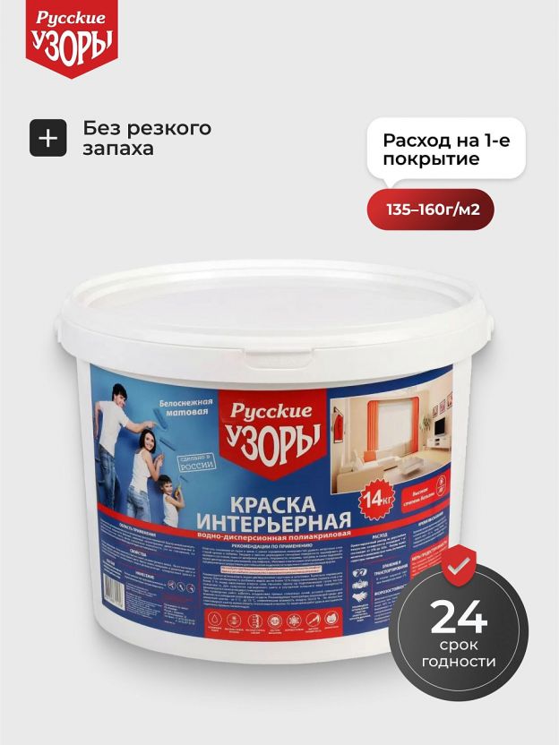 Краска водно-дисперсионная, Русские узоры, акриловая, интерьерная, матовая, белоснежная, 14 кг