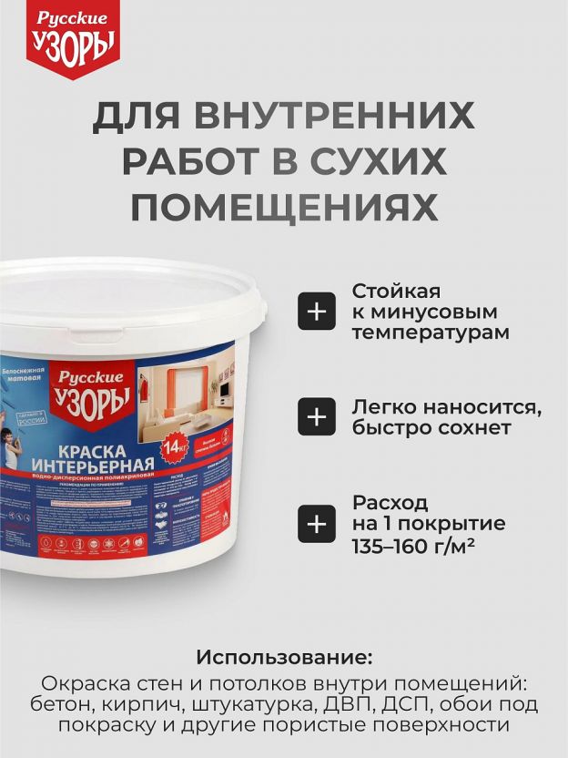 Краска Русские узоры предназначена для окрашивания стен и потолков внутри сухих помещений. Краску можно наносить на минеральные поверхности: бетонные, кирпичные, оштукатуренные; древесноволокнистые и древесностружечные плиты, ранее окрашенные поверхности, но не глянцевые, на предназначенные для окраски обои и другие пористые поверхности.