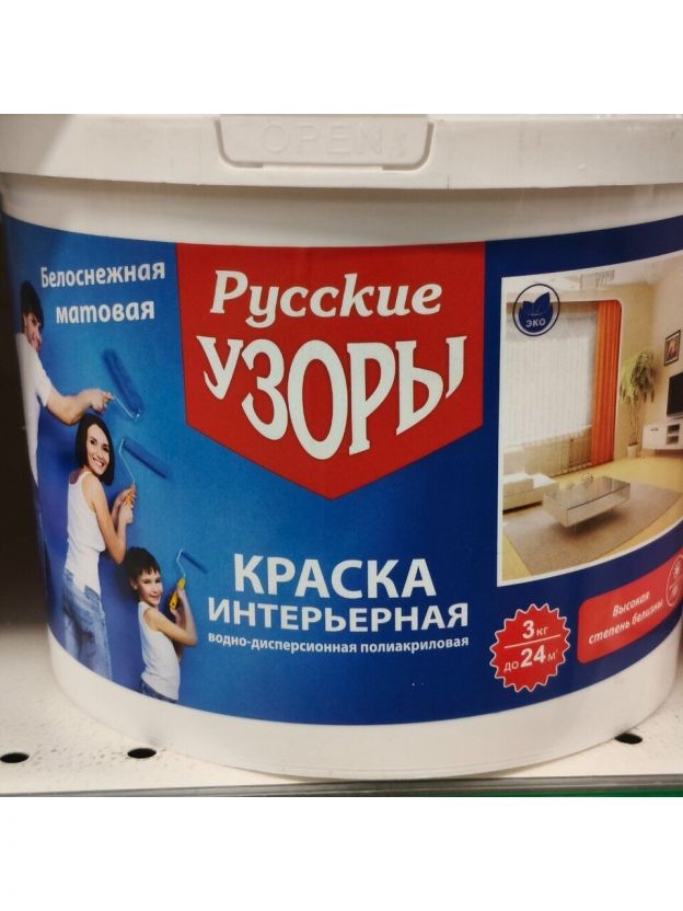 Краска водно-дисперсионная, Русские узоры, акриловая, интерьерная, матовая, белоснежная, 3 кг