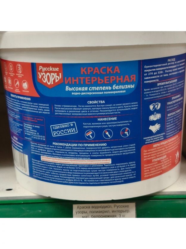 Краска Русские узоры предназначена для окрашивания стен и потолков внутри сухих помещений. Краску можно наносить на минеральные поверхности: бетонные, кирпичные, оштукатуренные; древесноволокнистые и древесностружечные плиты, ранее окрашенные поверхности, но не глянцевые, на предназначенные для окраски обои и другие пористые поверхности.