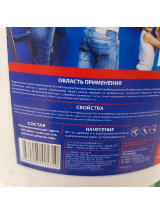 Краска полностью готова к применению. Она легко наносится, быстро сохнет, не имеет резкого запаха. После высыхания образует ровную, матовую пленку белого цвета. Краску можно колеровать в различные цвета и оттенки. Рекомендуется использовать водно-дисперсионные колеровочные краски и пасты.