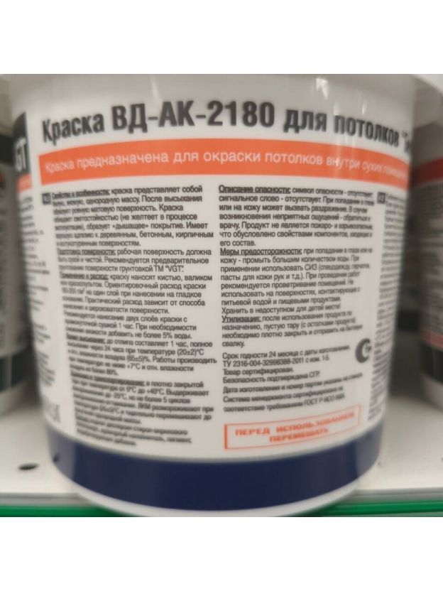 После высыхания краска образует ровную матовую поверхность, «дышащее» покрытие. Водно-дисперсионная краска VGT не мелит, имеет хорошую адгезию к бетонным, кирпичным, гипсокартонным и оштукатуренным поверхностям, является светостойкой, может использоваться как «эконом» вариант для окраски стен. При необходимости краску можно смыть при помощи жёсткой щётки и моющего средства.