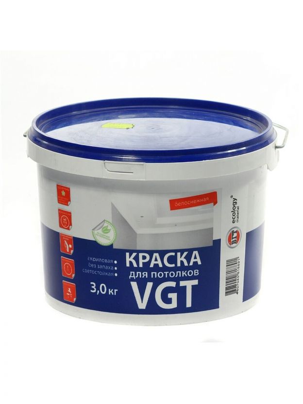 Краска водно-дисперсионная, VGT, акриловая, для потолков, матовая, белоснежная, 3 кг