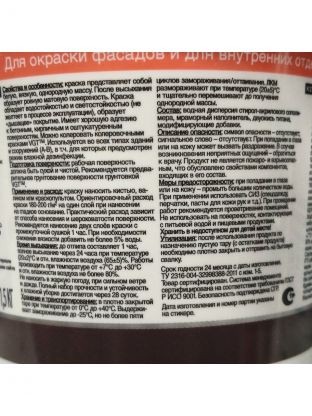 После высыхания данная краска образует ровную матовую поверхность и дышащее покрытие. Обладает высокой водо- и атмосферостойкостью, имеет хорошую адгезию к деревянным, бетонным, кирпичным, гипсокартонным и оштукатуренным поверхностям, а также является светостойкой. Используется для окраски фасадов и для внутренних работ во влажных помещениях.