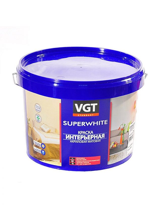Краска водно-дисперсионная, VGT, акриловая, интерьерная, влагостойкая, матовая, супербелая, 3 кг