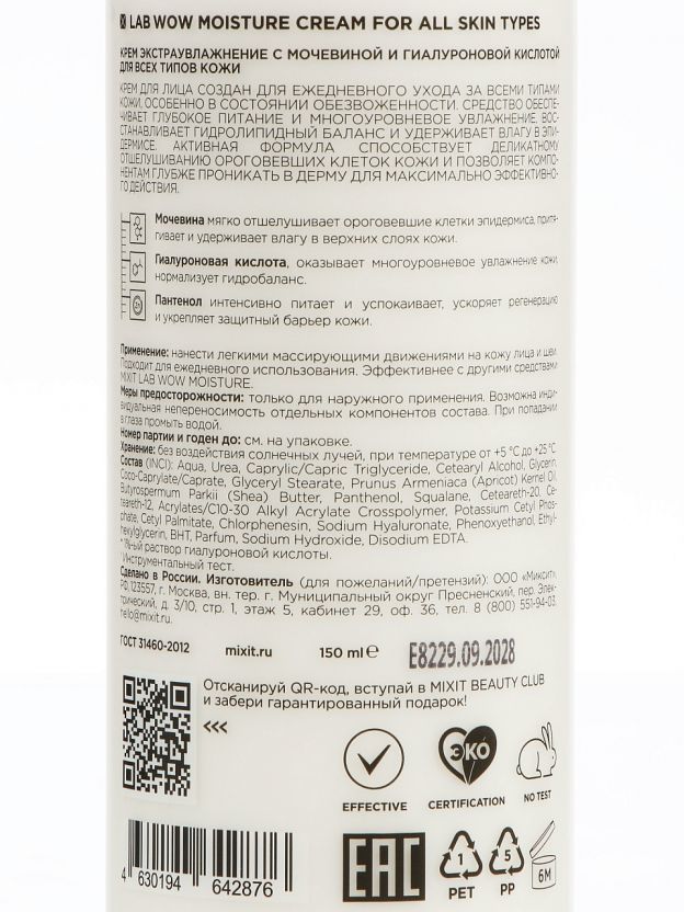 Крем для лица, Mixit, Lab Wow, экстраувлажнение, 150 мл, с мочевиной и гиалуроновой кислотой