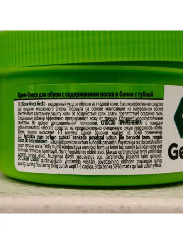 Способ применения: очистить поверхность изделия и нанести крем-блеск тонким слоем с помощью губки. Не требует дополнительной полировки.