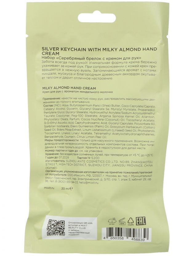 Крем для рук, Mixit, Silver Keychain, 20 мл, молочный миндаль + брелок
