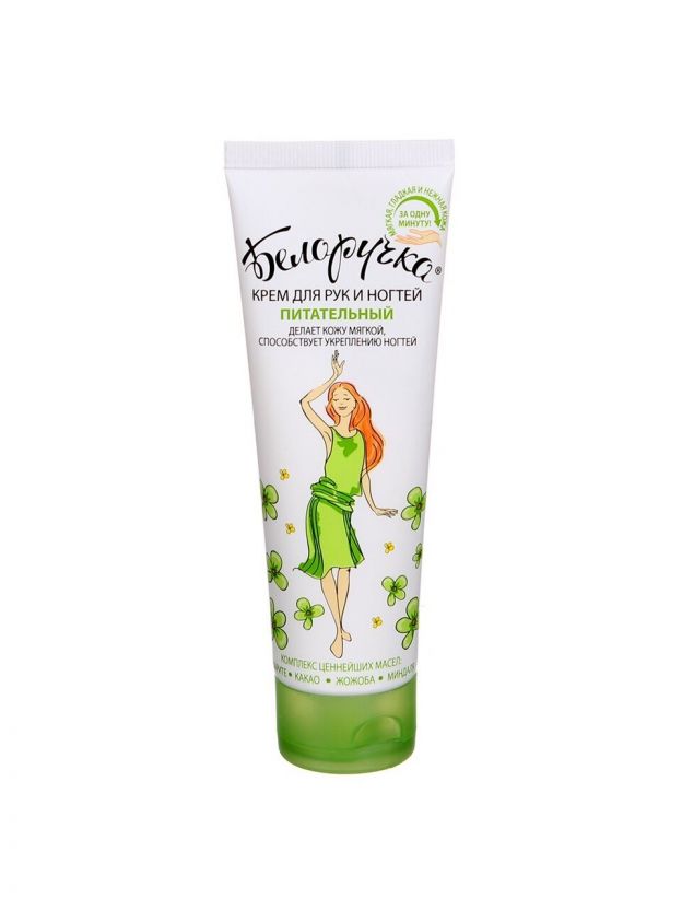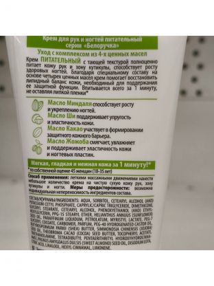 4 главные причины доверить красоту рук и ногтей крему Белоручка "Питательный" - это 4 ценных масла в его составе. Масло Миндаля, масло Ши, масло Жожоба, масло Какао - впечатляющий звездный состав, правда? Крем восстанавливает жировой баланс кожи и поддерживает его необходимый уровень, способствует укреплению ногтей и делает кожу мягкой и ухоженной.