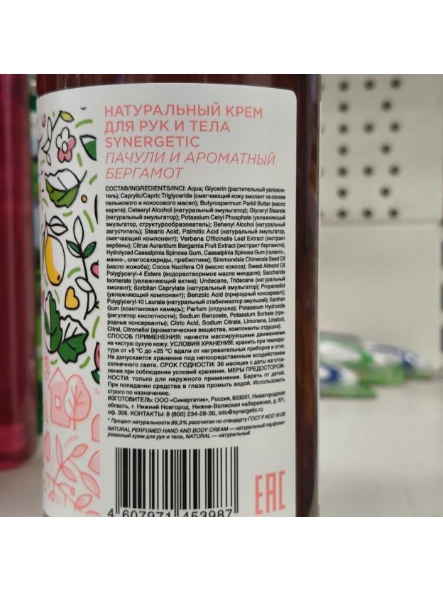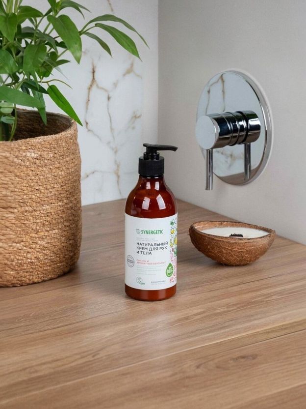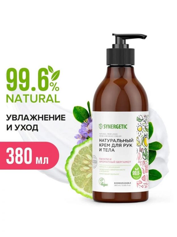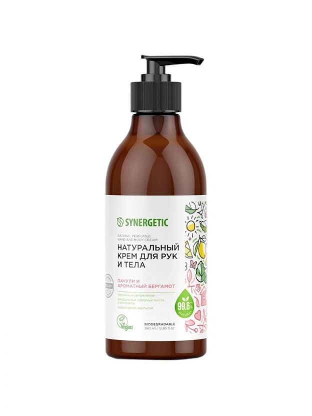 Крем для рук и тела, Synergetic, Пачули и ароматный бергамот, увлажнение, питание, 380 мл
