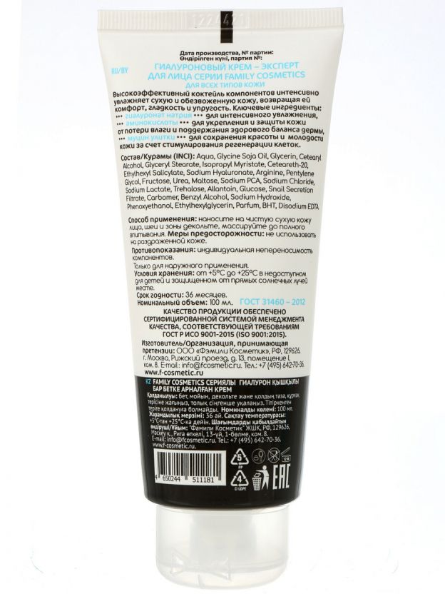 Гиалуроновый крем-эксперт Family Cosmetics: увлажнение для всех типов кожи, результат с первого применения, объём 100 мл — идеальный уход и экономия.