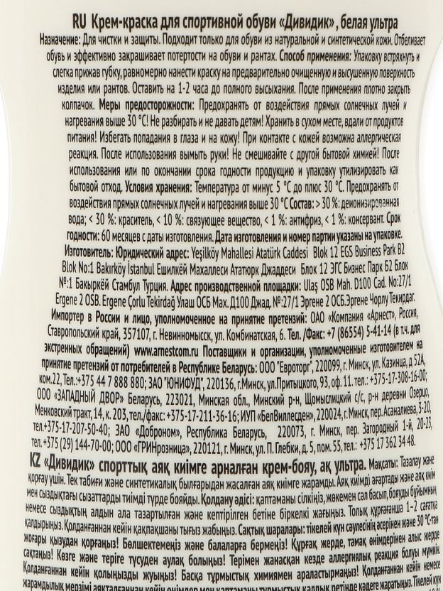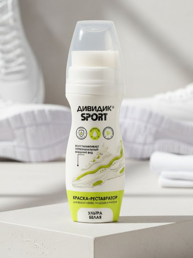 Крем-краска Дивидик для белой спортивной обуви — ваш быстрый способ вернуть обуви свежесть и белизну без лишних затрат. Благодаря специальной пигментированной формуле средство глубоко проникает в структуру материала, эффективно маскируя желтизну, пятна, следы соли и мелкие дефекты. Подходит для натуральной кожи, экокожи, синтетики и текстиля, что делает его универсальным выбором для ухода за кроссовками, кедами и другой спортивной обувью.