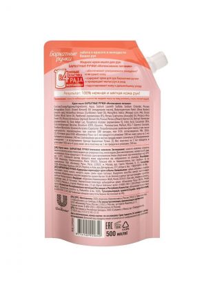 Бренд Бархатные ручки представляет жидкое крем-мыло Интенсивное питание в мягкой эко-упаковке с заботой о красоте и молодости Ваших рук! Крем-мыло содержит крем Бархатные Ручки, за счет чего обеспечивает нежное очищение и питание кожи во время мытья рук. Мыло удаляет бактерии, успешно смывая их с поверхности кожи вместе с другими ежедневными загрязнениями. Не содержит красителей. Соответствует естественному уровню pH кожи. Благодаря особой мягкой эко-упаковке используется в 4 раза меньше пластика, а цена мыла в 2 раза выгоднее по сравнению с обычной упаковкой мыла с дозатором. МАСЛО ШИ питает и восстанавливает клетки кожи. Масло ши оказывает смягчающее, увлажняющее и защитное действие. Подходит для ухода за кожей любого типа, особенно за сухой, раздраженной, поврежденной. Масло замедляет старение кожи. ПАНТЕНОЛ способствует восстановлению клеток, обладает увлажняющим и разглаживающим кожу действием. ВИТАМИН А ускоряет процесс обновления клеток кожи, участвует в образовании эпителия, в результате чего эпидермис производит больше белка, становясь толще. МАСЛО МИНДАЛЬНОЕ оказывает смягчающее, питательное и защитное действие на кожу, быстро впитывается. Ускоряет заживление при нарушениях целостности кожных покровов и нормализуют кислотно-щелочной баланс кожи. Подходит для любого типа кожи. ГЛИЦЕРИН оказывает смягчающее действие на кожу, увлажняет ее. Небольшие по размеру молекулы глицерина способны преодолевать липидный барьер кожи и проникать в глубокие слои эпидермиса. Исследования показали, что глицерин способствует нормальному процессу жизнедеятельности клеток эпидермиса. МАСЛО АВОКАДО замедляет старение кожи и предотвращает появление морщин. Питает кожу, способствует восстановлению ее защитного, иммунного барьера. Стимулирует выработку организмом коллагена и ускоряет процесс регенерации клеток кожи. МАСЛО КОСТОЧЕК ПЕРСИКА восстанавливает упругость, омолаживает, придает свежесть увядшей, морщинистой, утомленной и дряблой коже. РЕЗУЛЬТАТ: 100% нежная и мягкая кожа рук!