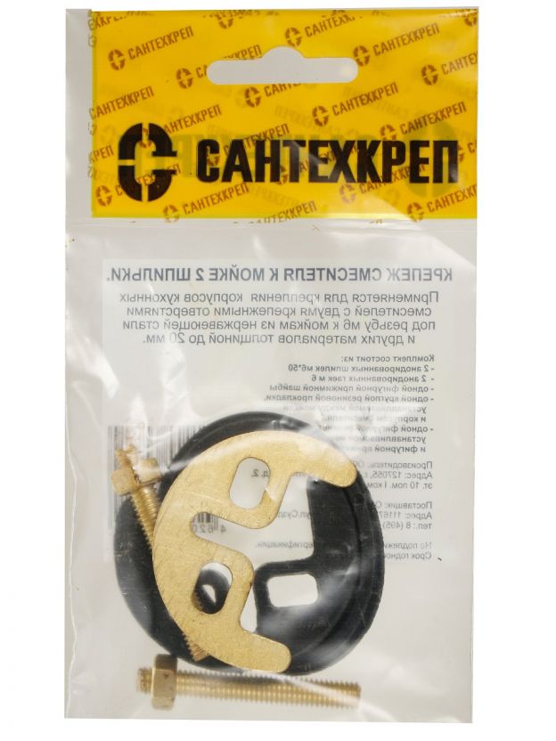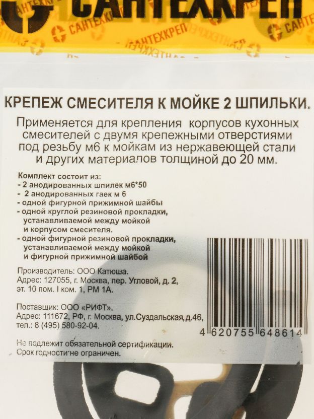 Крепеж смесителя к мойке, 2 шпильки, пакет с подвесом, стальные, покрытие желтое, СантехКреп, 1.5.6.