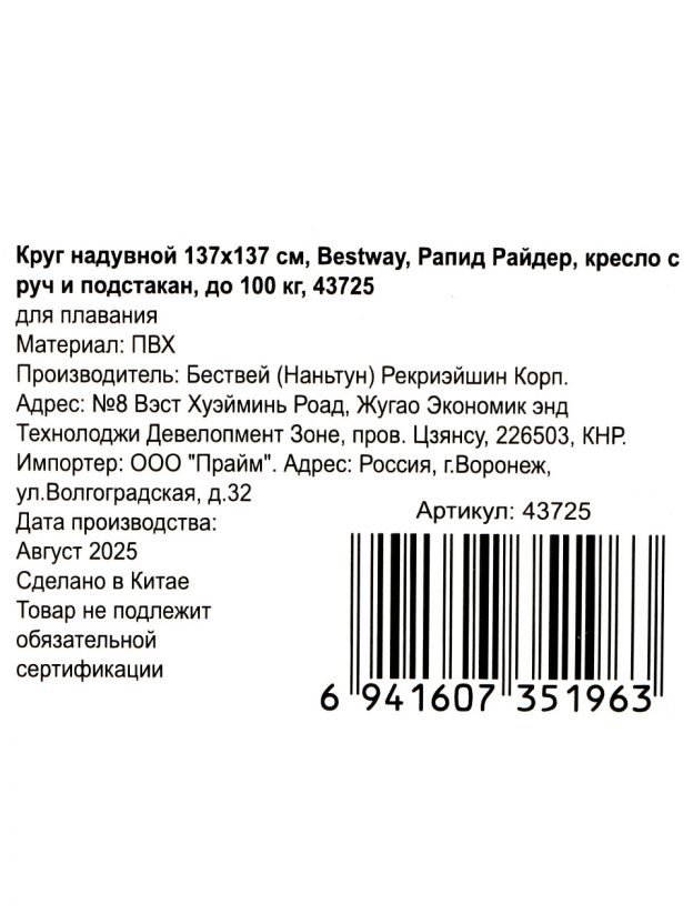 Какой максимальный вес выдерживает круг Bestway Рапид Райдер 137х137 см?
