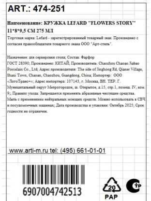 Кружка фарфор 275 мл FLOWERS STORY Lefard — стильный подарок и уют для дома: изящный рельеф, подарочная упаковка, подходит для СВЧ и посудомоечной машины.