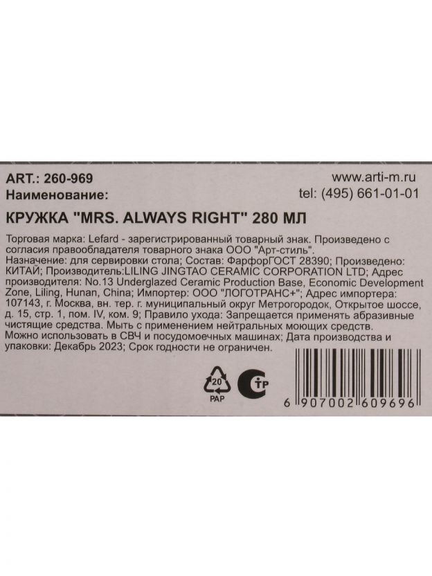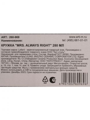 Кружка фарфор, 280 мл, Mrs. Always Right, Lefard, 260-969