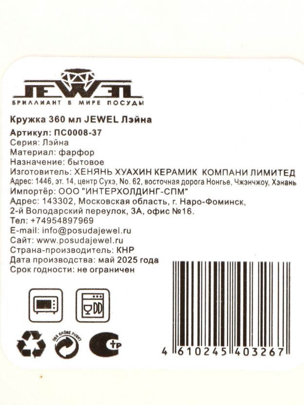 Кружка фарфор 360 мл Лейна Jewel — универсальное решение для дома и офиса: стильный белый дизайн, подходит для СВЧ и посудомоечной машины, оптимальный объём для кофе и чая.