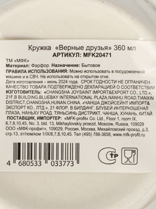 Кружка фарфор 360 мл «Верные друзья» от МФК (артикул MFK20471) сочетает в себе современный дизайн и практичность. Фарфор — это материал, который не впитывает запахи, легко моется и долго сохраняет тепло напитка. Благодаря объёму 360 мл кружка оптимальна для чая, кофе или даже супа, что часто ищут пользователи по запросу «какая кружка лучше для офиса» или «что подарить другу на праздник».