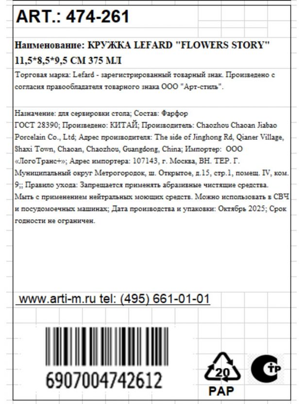 Кружка фарфор, 375 мл, Flowers Story, Lefard, 474-261
