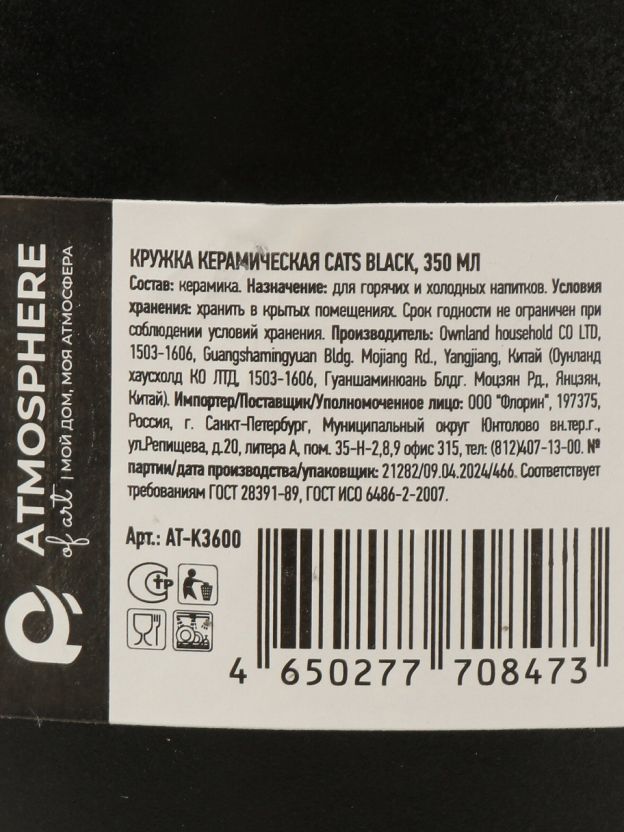 Да, кружка Cats Black Atmosphere 350 мл полностью подходит для мытья в посудомоечной машине — керамика устойчива к частым циклам мойки, рисунок не стирается.